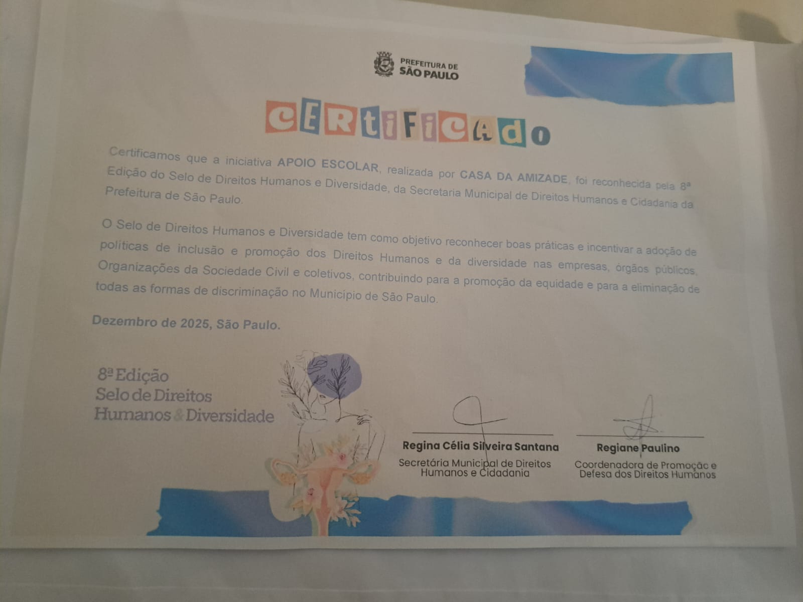 Estar ali representando a Casa da Amizade me encheu de orgulho e de um sentimento bonito de pertencimento. Ver nossa instituição reconhecida entre tantas que caminham pela dignidade humana me fez lembrar de cada criança, cada jovem, cada história que atravessa o nosso trabalho todos os dias. Senti que levava comigo não só o nome da Casa, mas os sonhos dos nossos alunos, a esperança das famílias e o esforço silencioso de cada educador que acredita que direito também se garante com afeto. Voltei para casa com o coração aquecido e a convicção de que fazemos parte de algo maior, que vai muito além de nós: uma rede que transforma, acolhe e reafirma que todos merecem oportunidades e respeito. E isso, para mim, é o verdadeiro sentido de lutar pelos direitos humanos. (F.H)