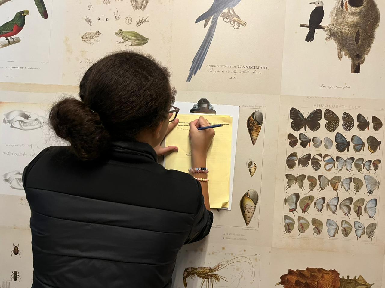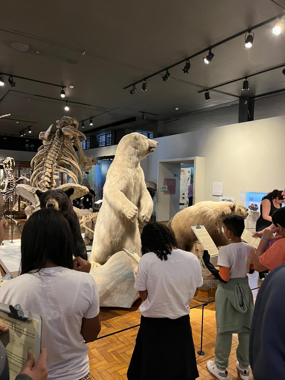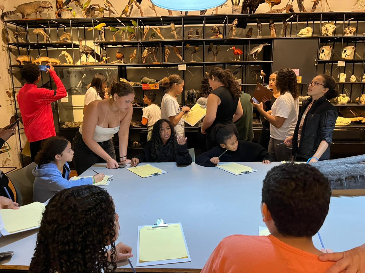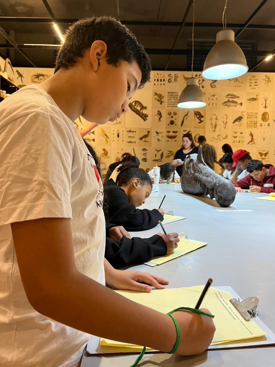 Ao chegar no Museu, os alunos foram divididos em equipes para facilitar a circulação. Cada grupo recebeu uma ficha de observação que precisava ser preenchida ao longo do passeio. Dentre as perguntas das fichas, havia: identificar animais carnívoros e as características que os tornam um, hábitos alimentares, identificar características dos biomas; todas essas questões foram tratadas durante o passeio. Ao final, deveriam fazer um desenho. E olha… saíram trabalhos lindos! Descobrimos vários talentos artísticos no meio da turma.